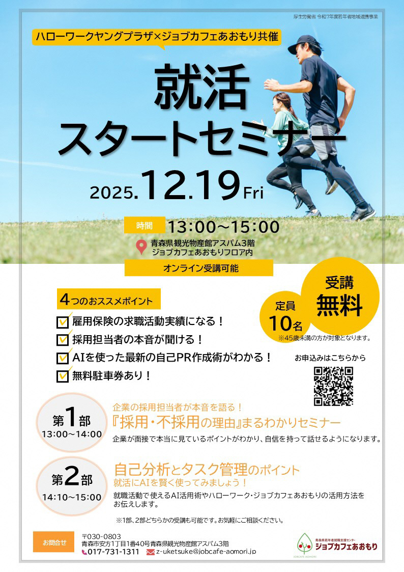 「就活スタートセミナー」は、ジョブカフェあおもりとハローワークヤングプラザが合同で開催する、就職活動の準備について学ぶ講座です。ハローワークからは就職活動の進め方や、ハローワークに届いた企業からの採用·不採用の理由を解説します。また、ジョブカフェあおもりでは、就職活動中のジョブカフェあおもりとハローワークヤングプラザの活用法や、履歴書作成や面接準備で使えるAI活用術などをお伝えいたします。ぜひご参加いただき、就活の不安を自信に変えましょう!気軽にご参加ください。